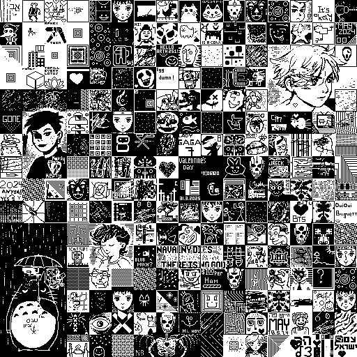 thing you'll encounter is a page with an image like this: It should be noted that glyph imagery is nothing new. Mayans and Egyptians used glyphs, and the word 'glyph' comes from (ancient?) Greek ('carving'). More recently, there is the work of Kenneth Knowlton, who in the 1960's used computers at Bell Labs to create images composed of glyphs. I first encountered one of Knowlton's pictures -- which seemed to combine Chuck Close and the teletype -- at the School of Visual Arts in the early 1990s. The present project does, however, shift the focus of authorship. It is an image-making system that can be altered from all over the Internet. It's not clear who owns the collaborative image. For my part, I encourage you to use it any way you see fit. I look forward to seeing what images develop. Finally, if you don't like the options given to you, please revise the source code. Copy it. Steal it. Share it. Print it. Pretend it's yours. I don't care.