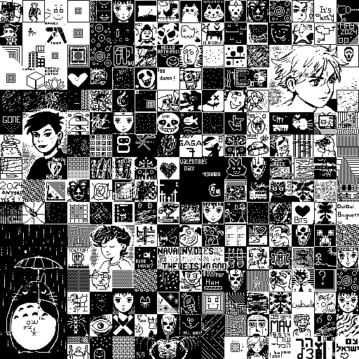 thing you'll encounter is a page with an image like this: It should be noted that glyph imagery is nothing new. Mayans and Egyptians used glyphs, and the word 'glyph' comes from (ancient?) Greek ('carving'). More recently, there is the work of Kenneth Knowlton, who in the 1960's used computers at Bell Labs to create images composed of glyphs. I first encountered one of Knowlton's pictures -- which seemed to combine Chuck Close and the teletype -- at the School of Visual Arts in the early 1990s. The present project does, however, shift the focus of authorship. It is an image-making system that can be altered from all over the Internet. It's not clear who owns the collaborative image. For my part, I encourage you to use it any way you see fit. I look forward to seeing what images develop. Finally, if you don't like the options given to you, please revise the source code. Copy it. Steal it. Share it. Print it. Pretend it's yours. I don't care.