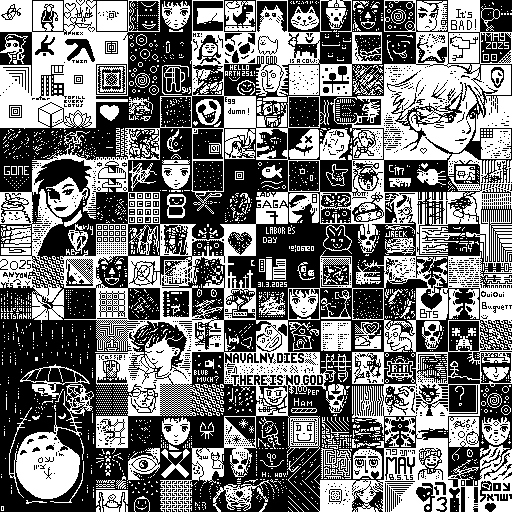 It should be noted that glyph imagery is nothing new. Mayans and Egyptians used glyphs, and the word 'glyph' comes from (ancient?) Greek ('carving'). More recently, there is the work of Kenneth Knowlton, who in the 1960's used computers at Bell Labs to create images composed of glyphs. I first encountered one of Knowlton's pictures -- which seemed to combine Chuck Close and the teletype -- at the School of Visual Arts in the early 1990s. The present project does, however, shift the focus of authorship. It is an image-making system that can be altered from all over the Internet. It's not clear who owns the collaborative image. For my part, I encourage you to use it any way you see fit. I look forward to seeing what images develop. Finally, if you don't like the options given to you, please revise the source code. Copy it. Steal it. Share it. Print it. Pretend it's yours. I don't care.